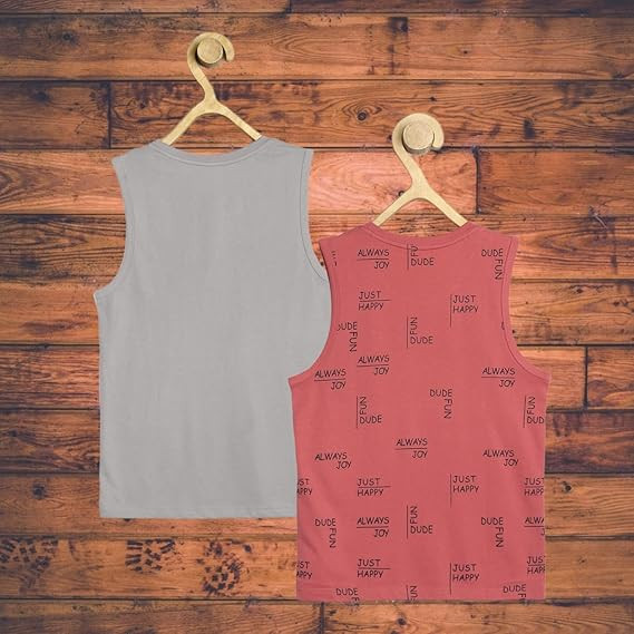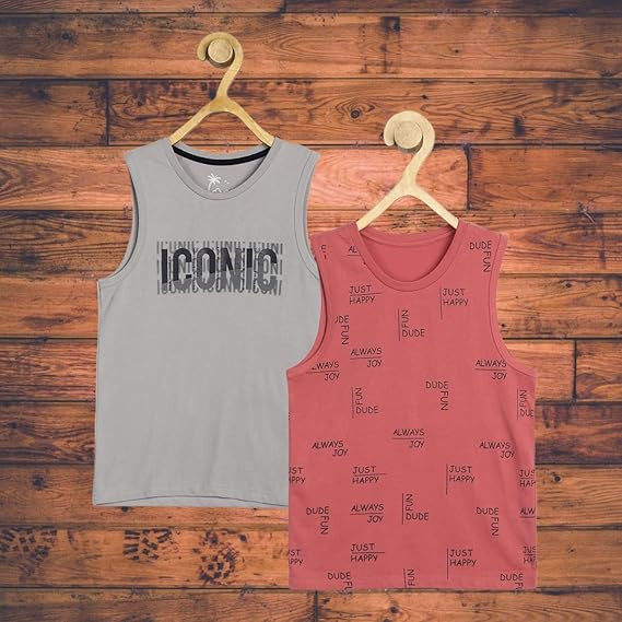 Care Instructions: Machine Wash Fit Type: Regular Weave type: Knit Round Neck sleeveless tee with Chest Print. Pack of 2 Proudly Made in India