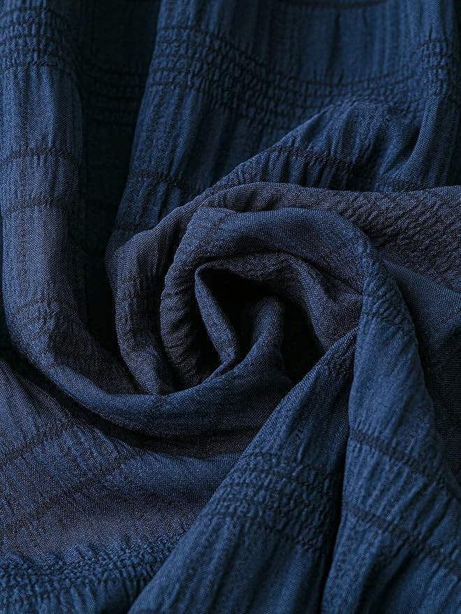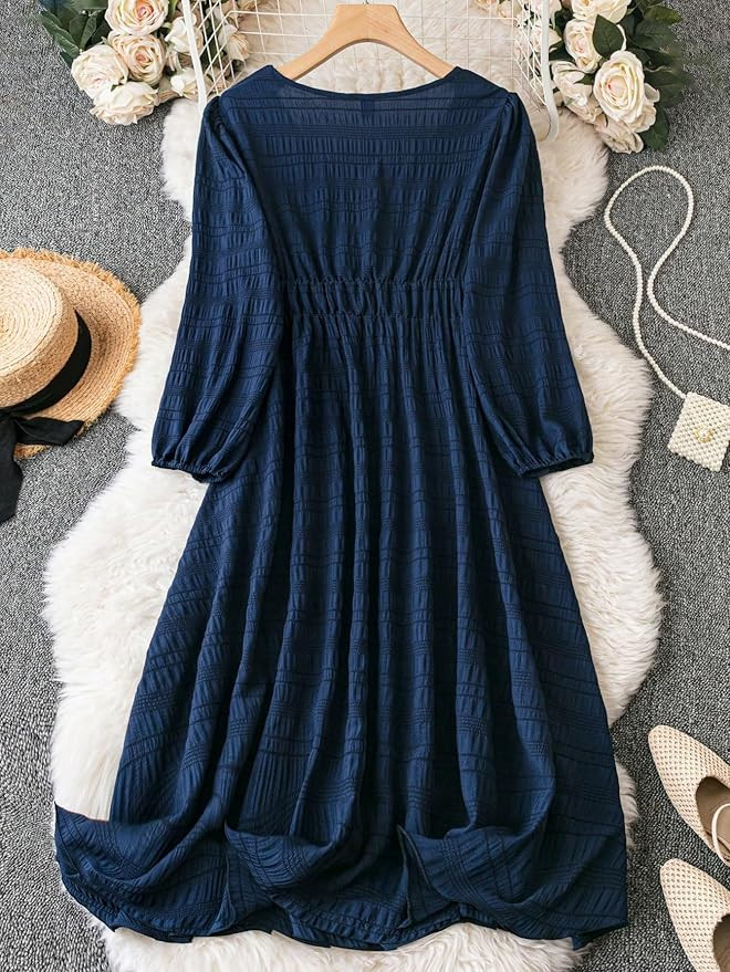 Fabric details : 100% Polyester Textured Dress II Print color:- Navy Blue II Type:- Midi Lenth Dresses for women II Style: Party wear V Neack Midi Dress Package Content : One pic Midi Dress For Women II Length:- Midi Where To Use: you can use this one piece dress for women party wear is used for western wear, office wear, night wear, beach wear, summer wear, hangouts, picnic, vacation wear, haldi & mehndi function wear and birthday party wear dress, while going to Hangouts, Picnic, Vacation Wear, Outings, Evenings, Party. Style & length: Solid Textured lantern sleeve dress for women western has midi length, front V Neck option with Tia in front of dress characterize this outfit. Size Guide : please use the infographic size chart guidance to determine your perfect size; a size large is recommended for a comfortable fit.