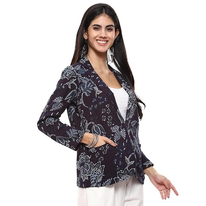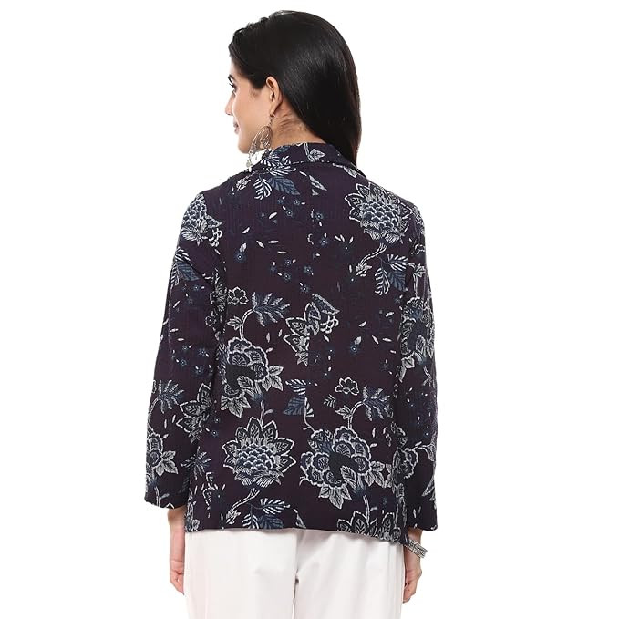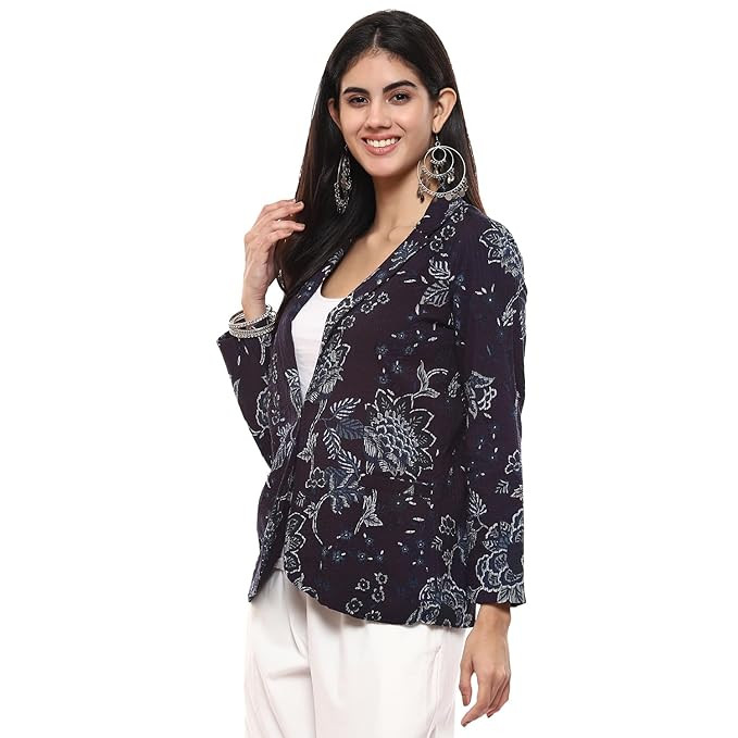 Product Type:- Jacket Color :-Navy Fabric:- Viscose Sleeve :-3/4th Sleeves Neck Type :-Collar Neck