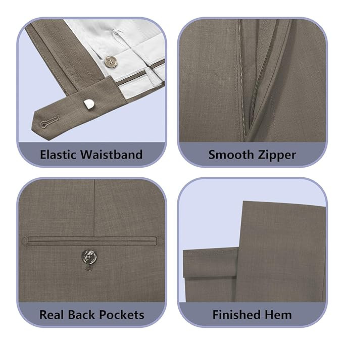 【PREMIUM FABRIC】 With 65% Polyester and 35% Rayon, this slim suit for men is comfortable, breathable, soft and easy to keep the shape. The durable stitching makes the suit have a long lifespan. 【MEN'S SUIT STRUCTURE】 Jacket: Single breasted one button closure/ Notch lapel/ 3 Practical inner pockets/ 4 Sleeve buttons each side/ 2 Front flap pockets/ 1 Real handkerchief pocket; Pants: Flat front/ Expandable waist/ Invisible zipper/ 2 Real back pockets; Vest: 5 buttons/ V-neck vest. 【SUITABLE FOR MUTIPLE SCENES】 Mens tuxedo suit set with a chic tailored look can make you be raved on different occasions, such as weddings, parties, business, prom, date and work. The classic beige suit is also a fantastic gift idea for your male friends. 【WHAT YOU GET & HOW TO KEEP】 With the affordable price, you'll get suit jacket*1, pants*1, vest*1 and tie*1. Dry clean only. Low iron if possible. Remember to hang the slim fit suit when you are not wearing them.