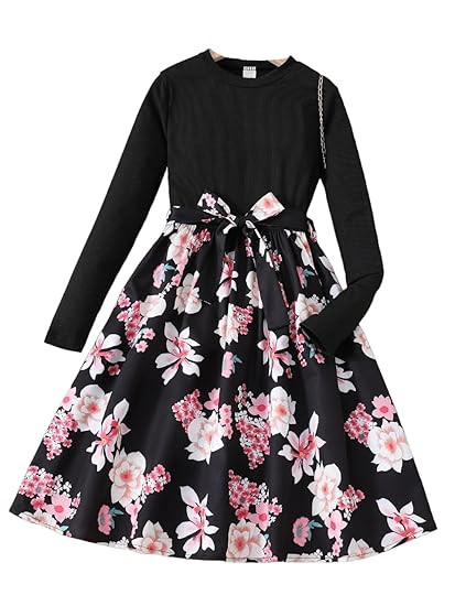 Girls Floral Print Dress Checkered Pattern Dress for Kids, Round Neck,Full SleeveFrock for girs with Belt KD-114-BLACK