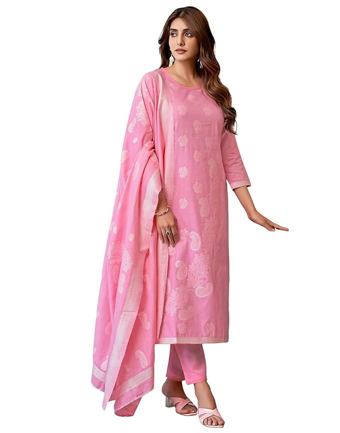 Women's Cotton Self Design Straight Kurta Pant with Dupatta Set
